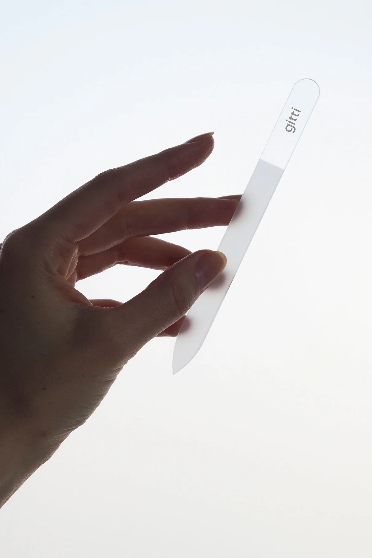 Drei Maniküre-Tools aus Glas: Feile, Nagelhautschieber & Buffer.